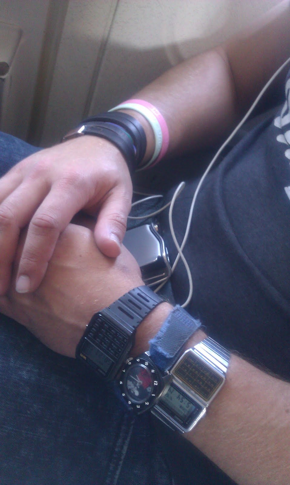 Get a load of this shiznit. Who would have thought three watches as accessories would equate to great style? And at that, retro Casio calculator watches? Crazy cool!
