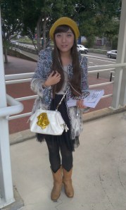 The darling at Darling Harbour. As we shed layers of clothing for warmer weather, Sydneyans bundle up for a cooler than usual winter season. Shadow, a uni student studying, get this, accounting, came to me as a surprise as I was around the corner of more flights of stairs. I was more concerned looking down at the stairs to not trip in my platform heels when she caught me off guard in her chicly cozy play on textures of boucle, fur, tulle, leather, and wool. A nod to her impeccable melange. She gets an A+!